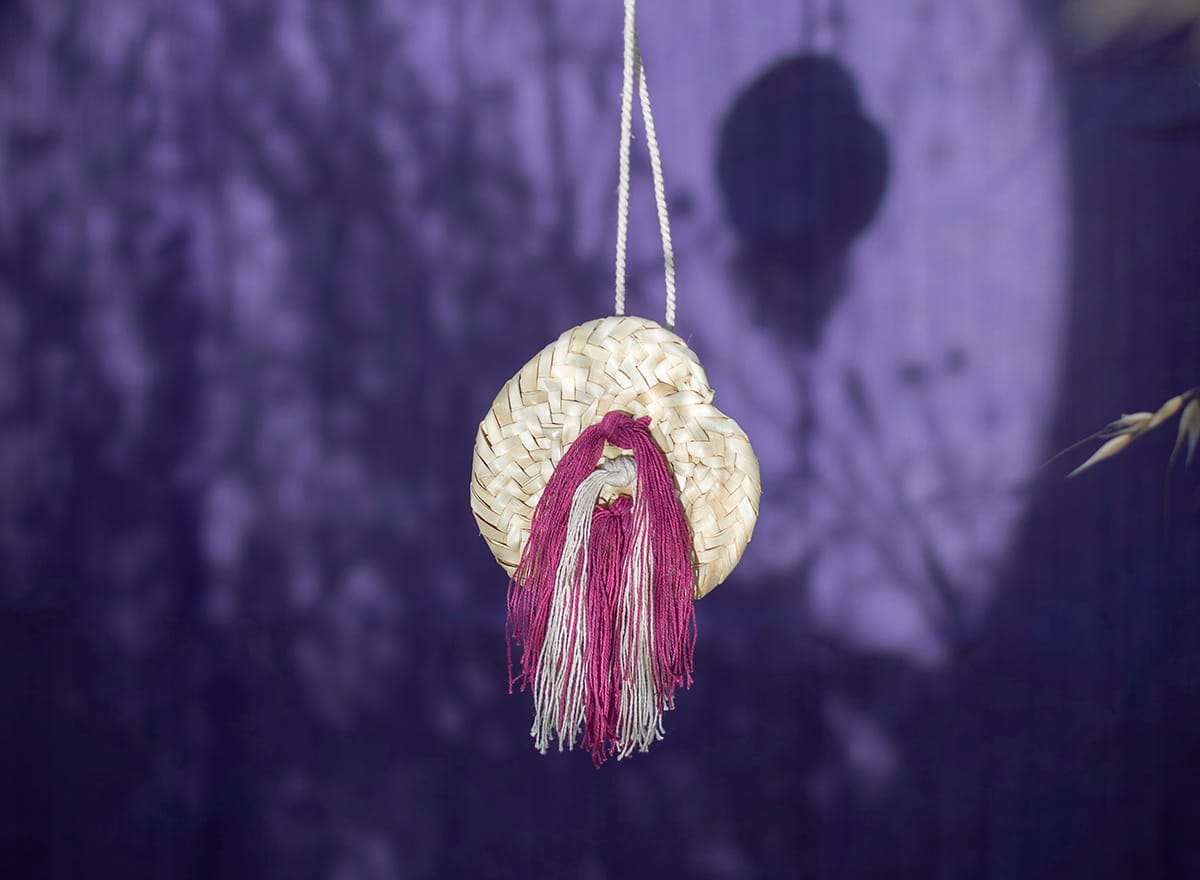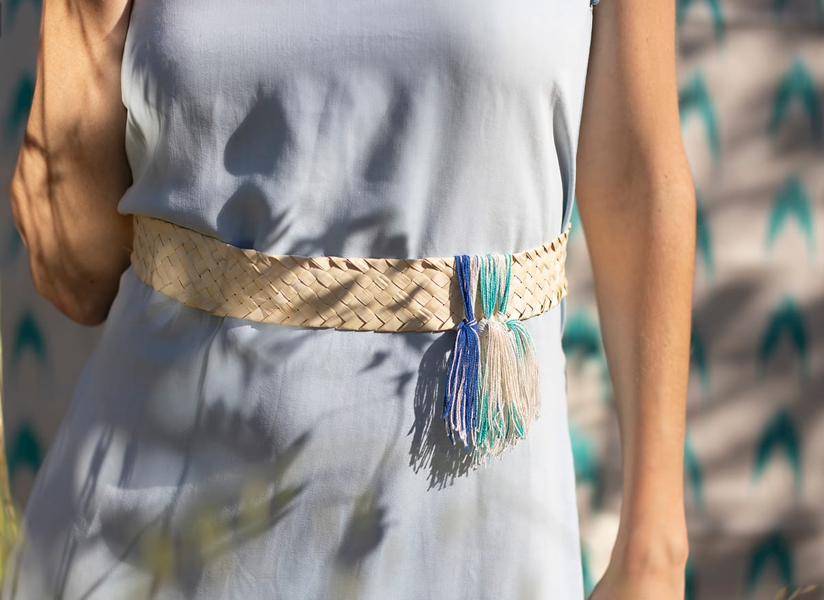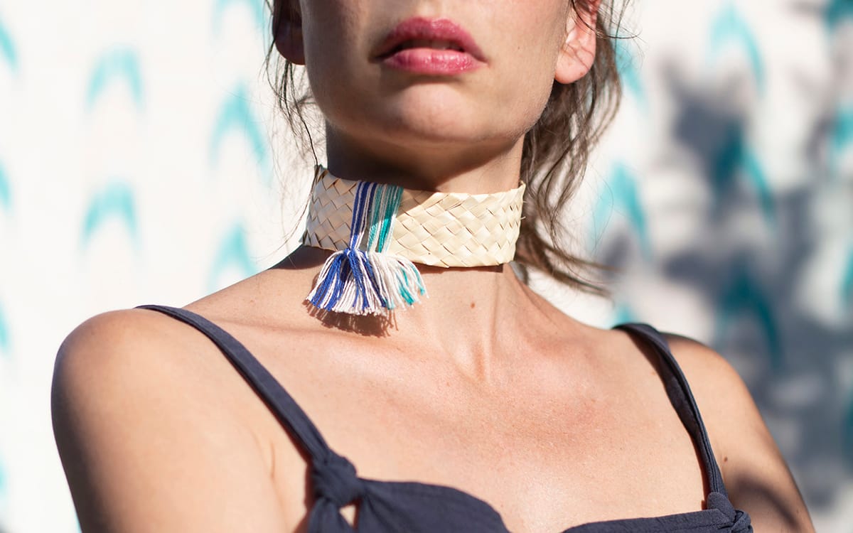 Pulseras, colgantes, gargantillas y cinturones de palmito con toques de colores mediterráneos azules, turquesas, morados y crudos, en forma de “llengües” deconstruidas hasta su mínima expresión, los hilos de algodón.